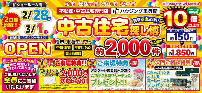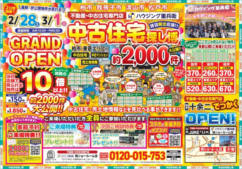 ハウジング重兵衛の柏ショールーム店内に、土地・中古住宅専門店がオープン! 2026年2月28日(土)・3月1日(日)の2日間限定でグランドオープンイベントを開催します。 成田市をはじめとした北総エリアの中古住宅、中古マンション、土地の情報を多数ご用意しております。 家づくりを考えていたけれど、土地から探した方が良いのか判らない・・・ 中古住宅を購入してリノベーションして住みたい・・・ といったご相談も大歓迎です。 リフォームが基盤であるハウジング重兵衛のノウハウと合わせて、お客様のご要望を丁寧にお伺いします。 グランドオープンイベントならではの来場特典を多数用意してお待ちしております。 なお、事前にご予約いただくと更にQUOカードのプレゼントもございます。 今年こそ、賃貸から持ち家に。 資金計画などのお悩みもぜひお気軽にお話ください。 皆さまのご来場を、心よりお待ちしております。