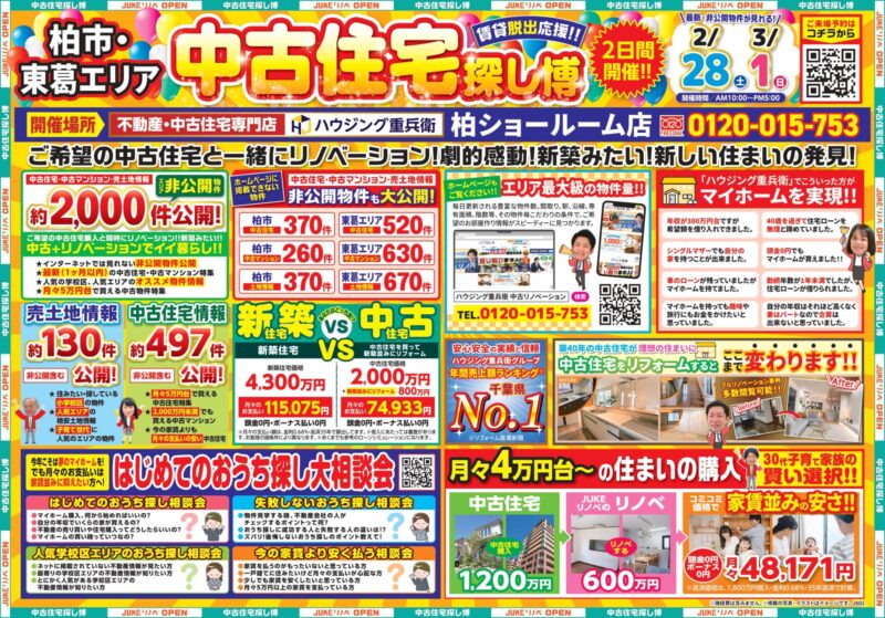 ハウジング重兵衛の柏ショールーム店内に、土地・中古住宅専門店がオープン! 2026年2月28日(土)・3月1日(日)の2日間限定でグランドオープンイベントを開催します。 成田市をはじめとした北総エリアの中古住宅、中古マンション、土地の情報を多数ご用意しております。 家づくりを考えていたけれど、土地から探した方が良いのか判らない・・・ 中古住宅を購入してリノベーションして住みたい・・・ といったご相談も大歓迎です。 リフォームが基盤であるハウジング重兵衛のノウハウと合わせて、お客様のご要望を丁寧にお伺いします。 グランドオープンイベントならではの来場特典を多数用意してお待ちしております。 なお、事前にご予約いただくと更にQUOカードのプレゼントもございます。 今年こそ、賃貸から持ち家に。 資金計画などのお悩みもぜひお気軽にお話ください。 皆さまのご来場を、心よりお待ちしております。